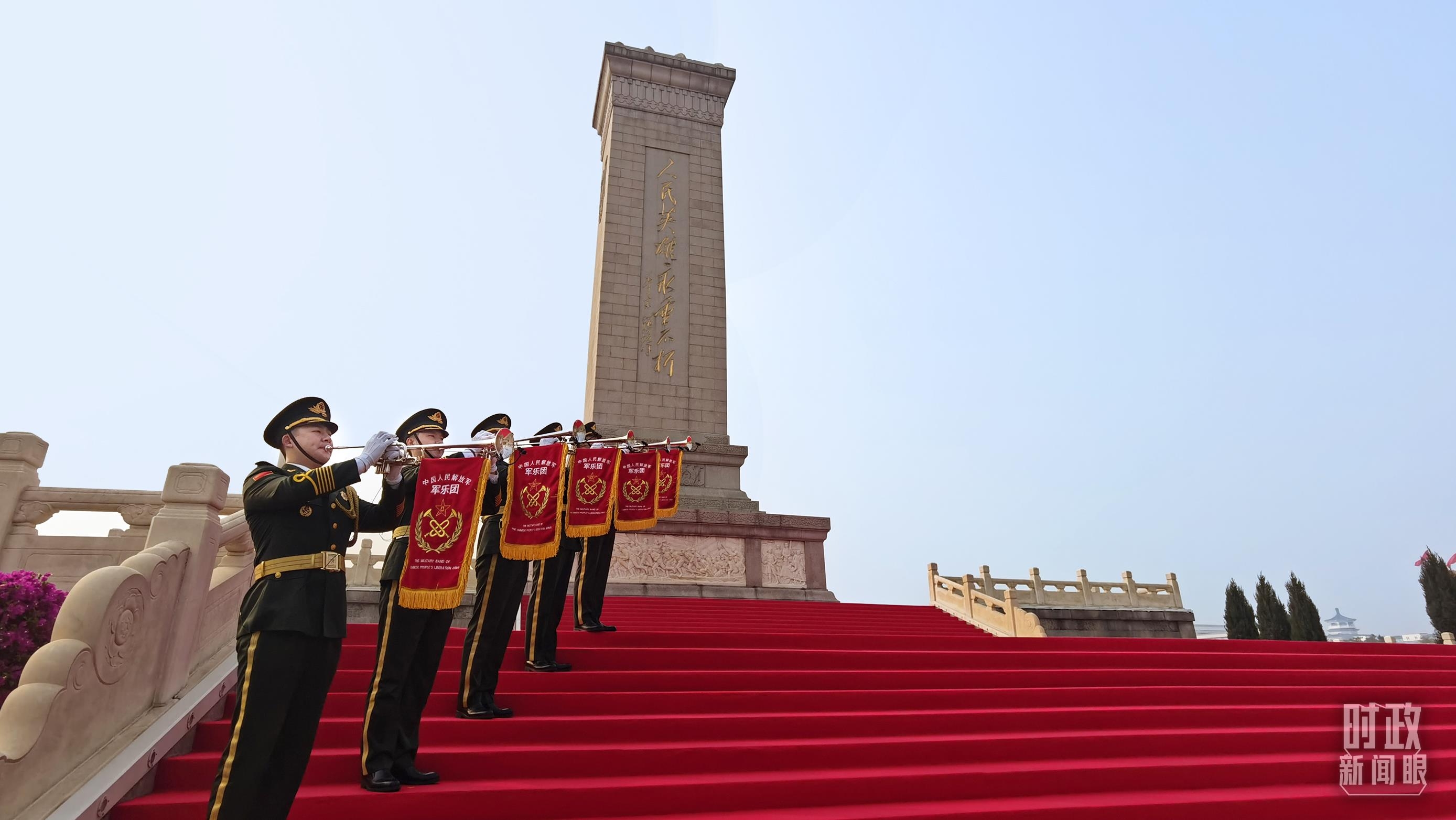△现场的9个花篮由18名礼兵抬至纪念碑基座上。(总台央视记者罗晓丹、钟信伟拍摄)