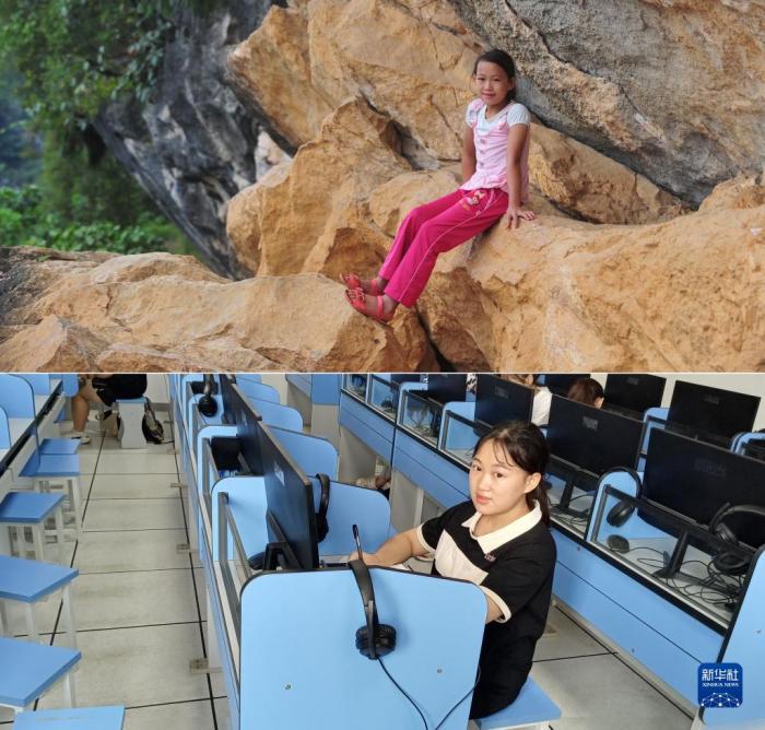 这是一张拼版照片,上图为:在广西大化瑶族自治县板升乡弄雷村哈保屯,11岁的蒙秋艳在悬崖边休息,这一处约300米长的半山悬崖,是她读小学期间每天都要走的路(2012年9月5日新华社记者黄孝邦摄);下图为:已经实现大学梦想的蒙秋艳,就读于广西医科大学,这是她在学校的语音室学习(新华社发,2022年9月5日韦婷婷摄)。新华社发