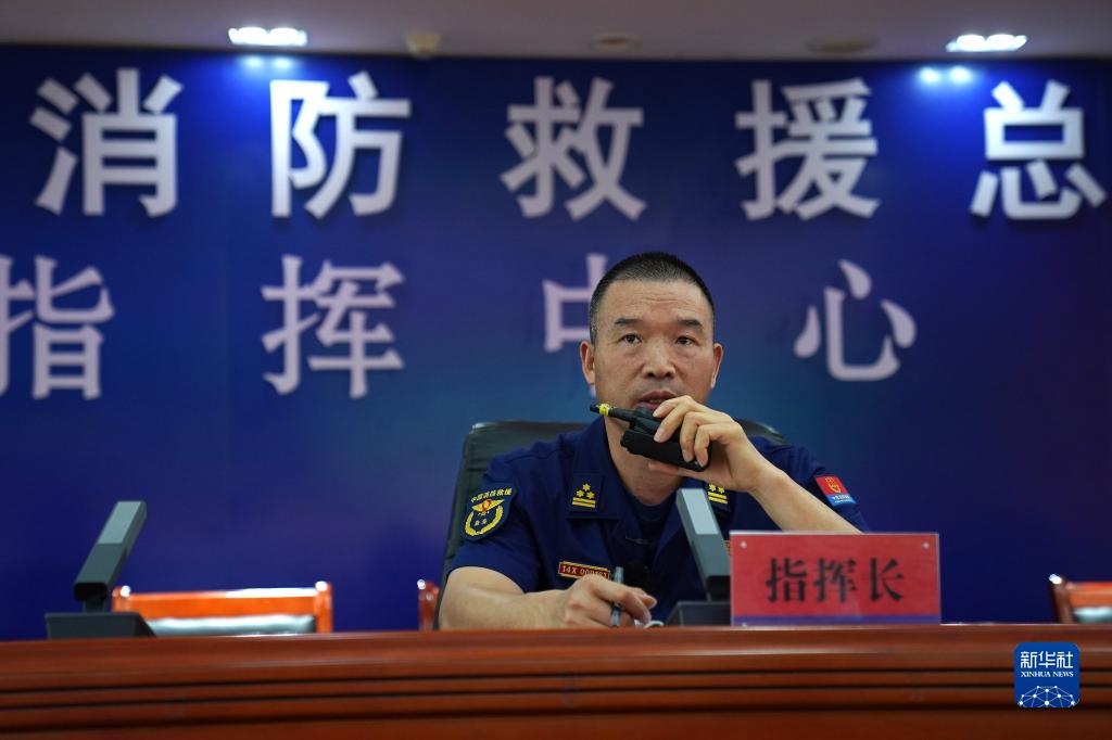 江西省消防救援总队指挥中心专业技术一级指挥长李胜利在江西消防救援总队指挥中心进行远程调度(2022年9月14日摄)。新华社记者 万象 摄