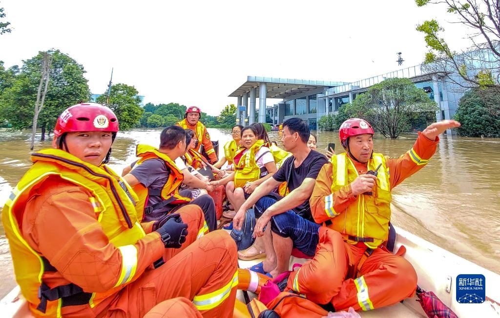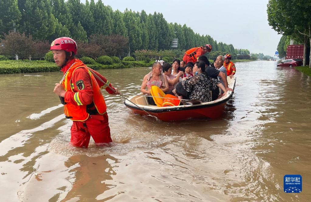 在河南省郑州市中牟县,李胜利(左一)在疏散被困群众(2021年7月19日摄)。新华社发(田聪 摄)