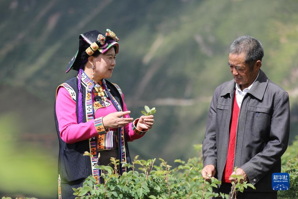 9月25日,陈望慧在四川阿坝州小金县新桥乡共和村与村民喻福良探讨种植经验。新华社记者 刘琼 摄