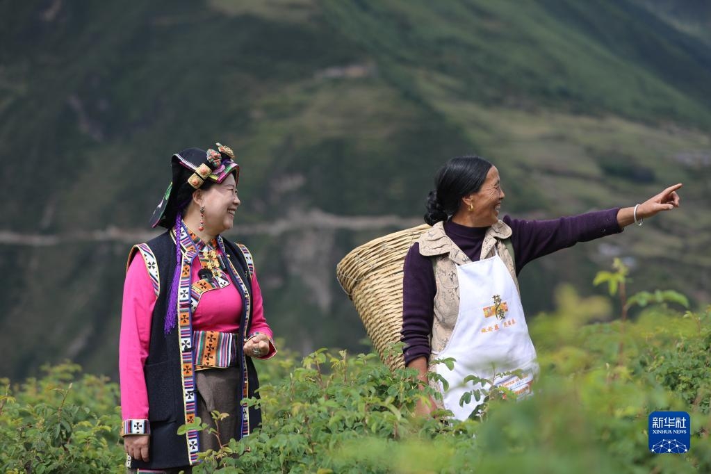 9月25日,陈望慧在四川阿坝州小金县新桥乡共和村的玫瑰园中与村民交流。新华社记者 刘琼 摄