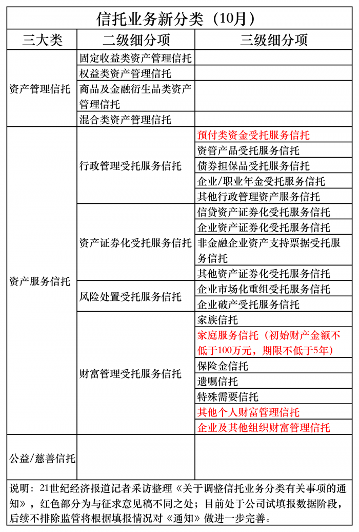 记者根据采访梳理,对比《征求意见稿》来看,此次下发的《通知》主要有三处修改,均集中在资产服务信托大类项下。一是将“涉众性社会资金受托服务信托”改为了“预付类资金受托服务信托”;二是在“财富管理受托服务信托”项下,新增了“家庭服务信托”;三是将“财富管理受托服务信托”项下的“其他财富管理信托”改为了“其他个人财富管理信托”和“企业及其他组织财富管理信托”。