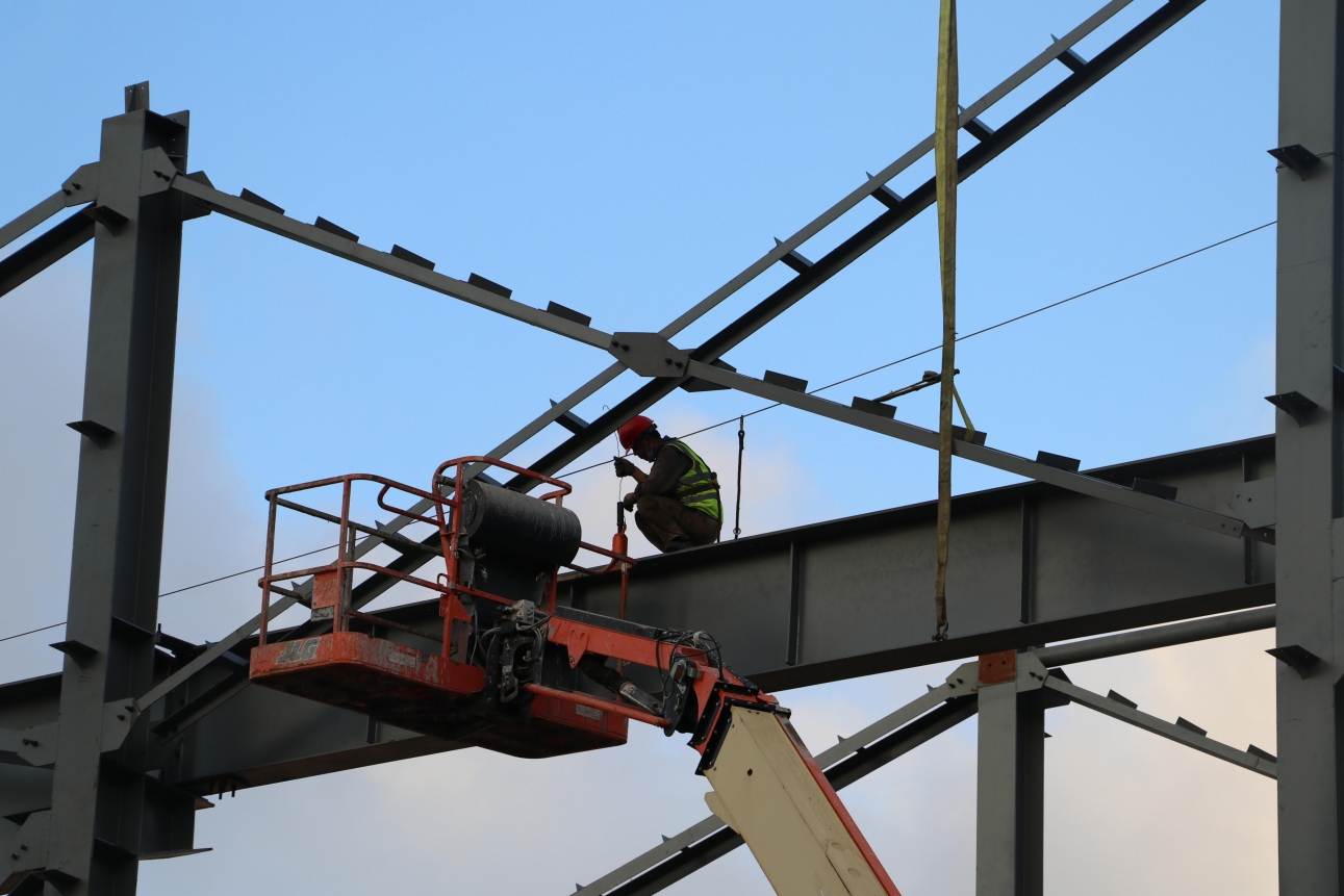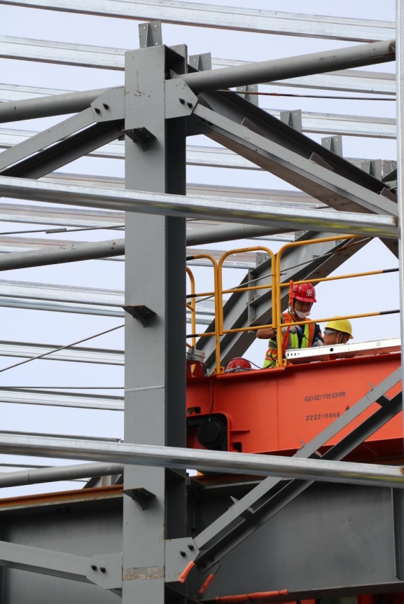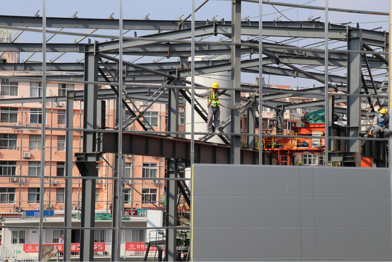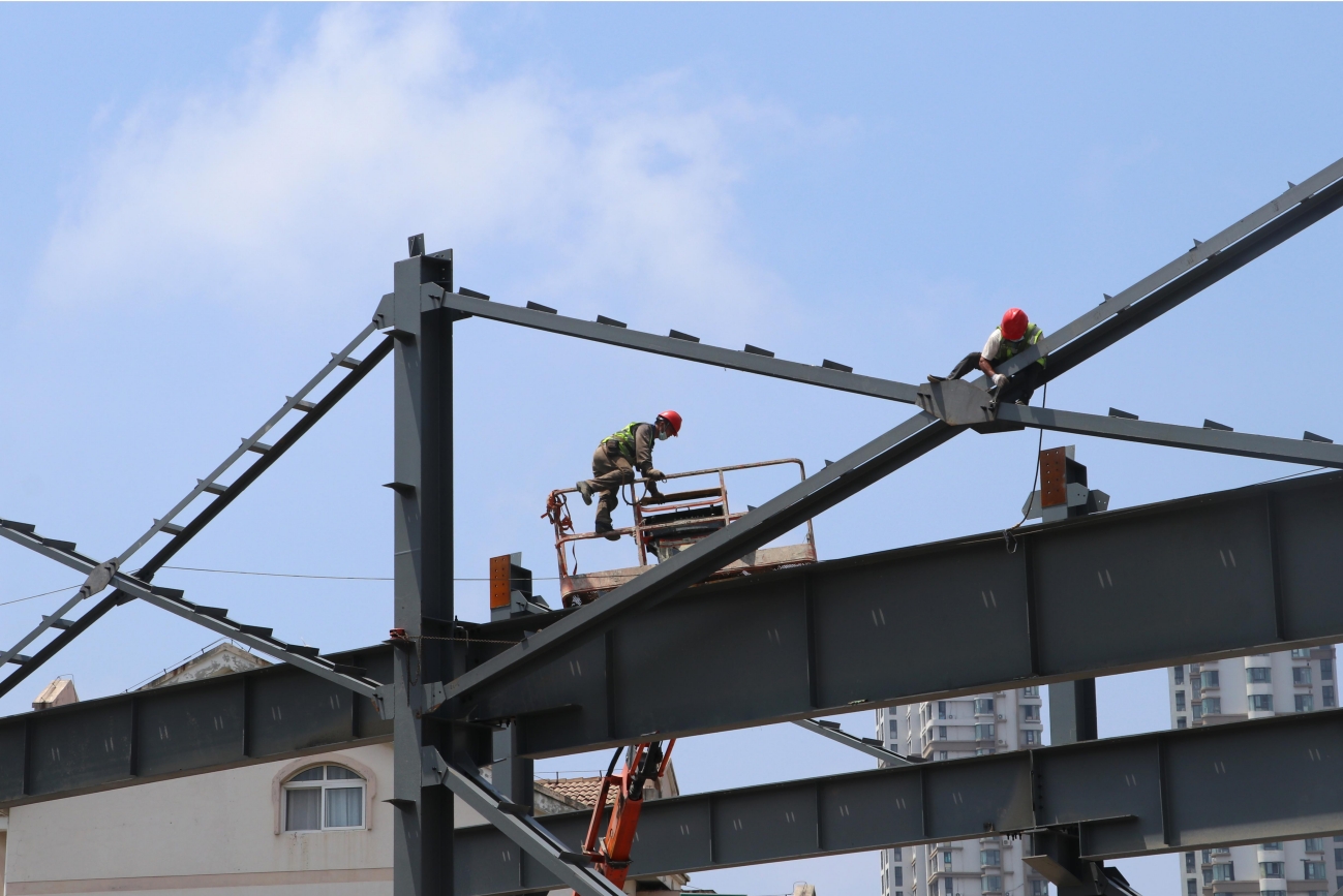 建筑工人在搭建钢结构封闭大棚