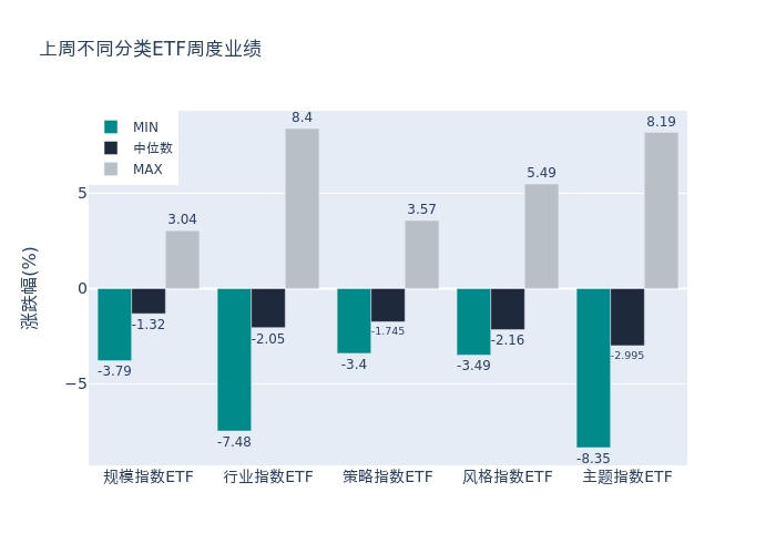 节前一周股票型ETF周度收益率中位数为-2.22%。其中按照不同分类,规模指数中中药ETF周度收益率最高,为3.04%;行业指数中招商中证全指医疗器械ETF周度收益率最高,为8.4%;策略指数中质量ETF周度收益率最高,为3.57%;风格指数中嘉实医药健康100ETF周度收益率最高,为5.49%;主题指数中医疗设备ETF周度收益率最高,为8.19%。