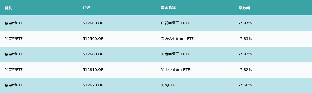 节前一周股票型ETF跌幅最大的5支ETF及其收益率分别为:广发中证军工ETF(-7.87%)、易方达中证军工ETF(-7.83%)、国泰中证军工ETF(-7.83%)、华宝中证军工ETF(-7.82%)、国防ETF(-7.66%)。详情见下表: