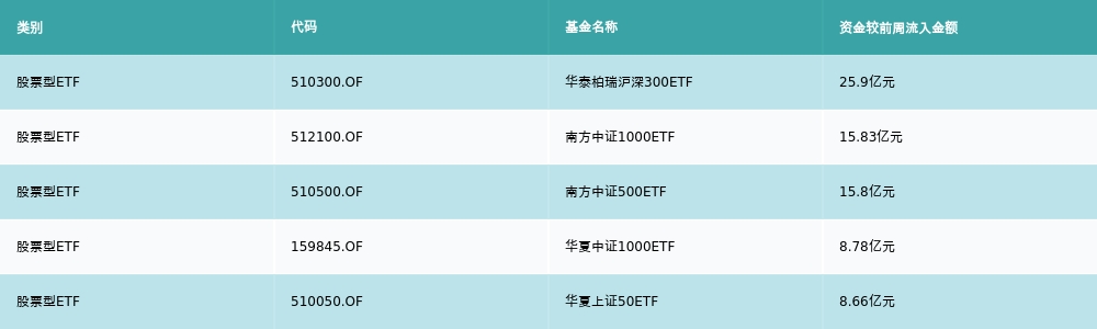 节前一周股票型ETF资金流入最多的5支ETF及其流入金额分别为:华泰柏瑞沪深300ETF(流入25.9亿元)、南方中证1000ETF(流入15.83亿元)、南方中证500ETF(流入15.8亿元)、华夏中证1000ETF(流入8.78亿元)、华夏上证50ETF(流入8.66亿元)。详情见下表: