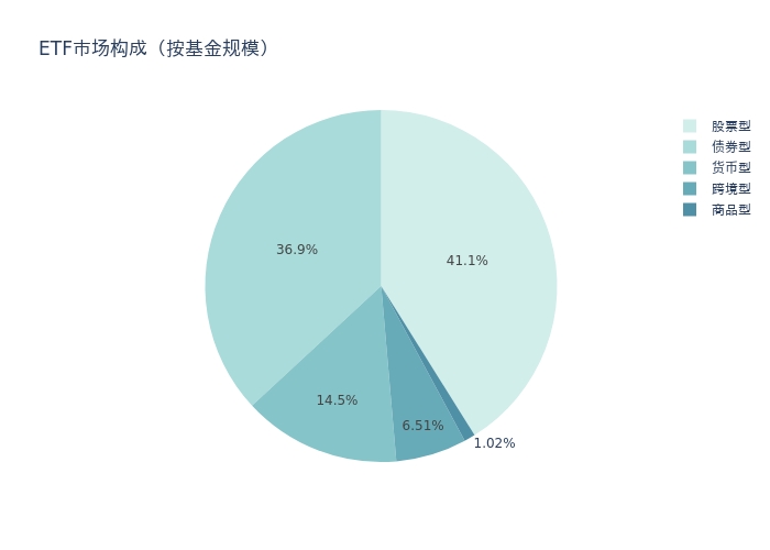 基金规模方面,节前一周ETF市场总规模达到22655.05亿元,较前一周减少108.66亿元。其中,股票型ETF为9310.09亿元,债券型ETF为8358.15亿元,货币型ETF为3281.19亿元,商品型ETF为231.67亿元,跨境型ETF为1473.95亿元。