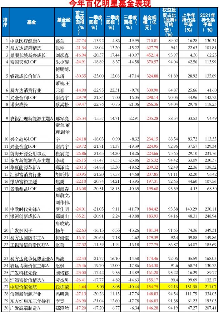 百亿明星基金中,唯一一只前三季取得正收益的基金是丘栋荣管理的中庚价值领航,前三季度收益为1.64%,该基金二季度末规模为154.75亿元。