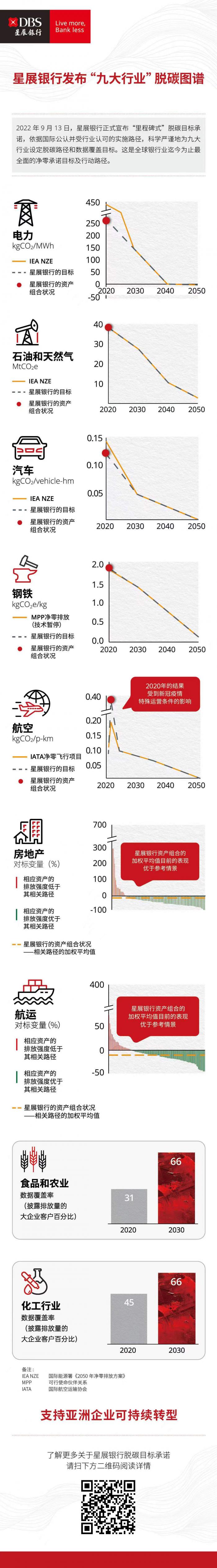 今年9月,星展银行宣布其脱碳承诺,为碳排放较为集中的九大行业设定脱碳路径和数据披露目标,从而实现2050年融资净零排放目标承诺。其中七个行业板块设定了具体的脱碳目标和实施路径,包括电力、石油和天然气、汽车、航空、航运、钢铁及房地产;另外,为包括食品在内的农业以及化工行业设定了数据覆盖目标,为其未来实现脱碳目标铺平道路。该净零方案涵盖了星展银行融资项目和资本市场活动中碳密集程度最高的行业板块,占星展银行未偿贷款总额的31%。