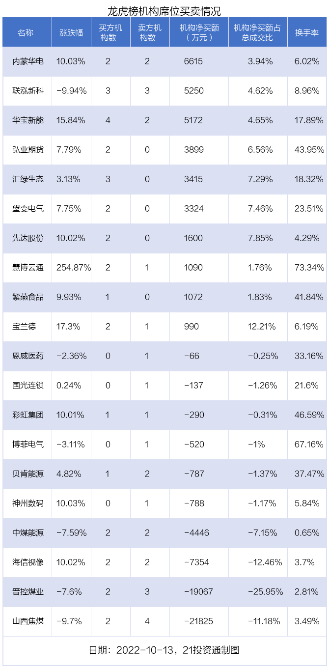 10月13日,20只个股龙虎榜出现了机构的身影,机构合计净卖出2.29亿元。具体来看,机构净买入10股,净卖出10股。