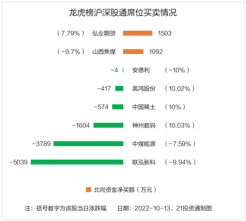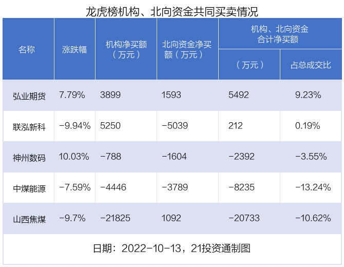 值得注意的是,机构和北向资金共同净买入了弘业期货;共同净卖出了神州数码、中煤能源等2股;在山西焦煤,联泓新科上出现分歧,机构净卖出山西焦煤2.18亿元,北向资金净买入1091.72万元;机构净买入联泓新科5250.19万元,北向资金净卖出5038.67万元。