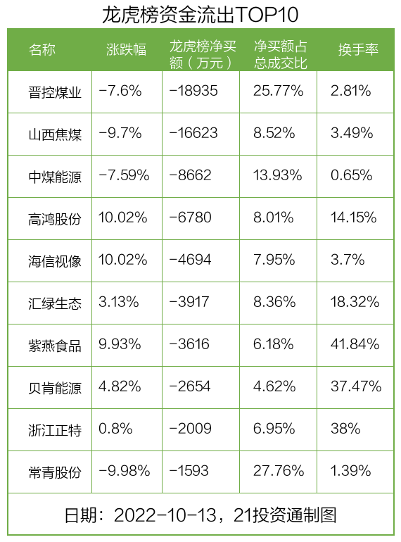 而龙虎榜中资金净流出最多的是晋控煤业(601001.SH),被净卖出为1.89亿元,占总成交金额的25.77%。晋控煤业收盘下跌7.6%,换手率为2.81%。