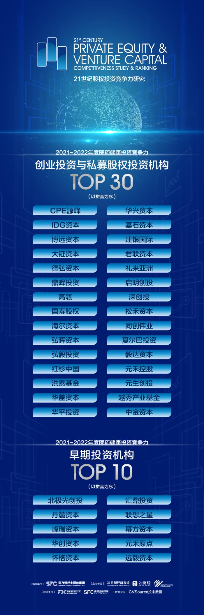 在以医药健康投资作为重点关注方向的诸多投资机构中,21世纪经济报道、21世纪创投研究院通过对数百家投资机构的调研、走访与问卷发放,收集各基金募资,医药健康领域投资、退出,及被投项目的后续轮融资等业绩表现,同时参考第三方机构CVSource投中数据的数据,再结合行业专家评委会对拟上榜机构在ESG等方面的考量,“2021-2022年度医药健康领域投资竞争力研究案例”由此新鲜出炉。下为具体榜单: