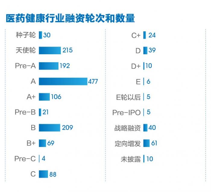 从投资阶段看,统计期间内,A轮融资事件最多,共计477起,其次为天使轮、B轮和PRE- A轮,分别为215起、209起和192起,四项总计占全部融资事件的67%以上。整体趋势上,医药健康行业融资以中早期阶段的项目为主,由于后期项目投资估值较高,而机构更希望从早期项目中发现机会,但同时也无形中增加了投资风险。但值得注意的是,种子轮、天使轮的融资活跃程度有所下降,市场对较早阶段的项目愈发谨慎。