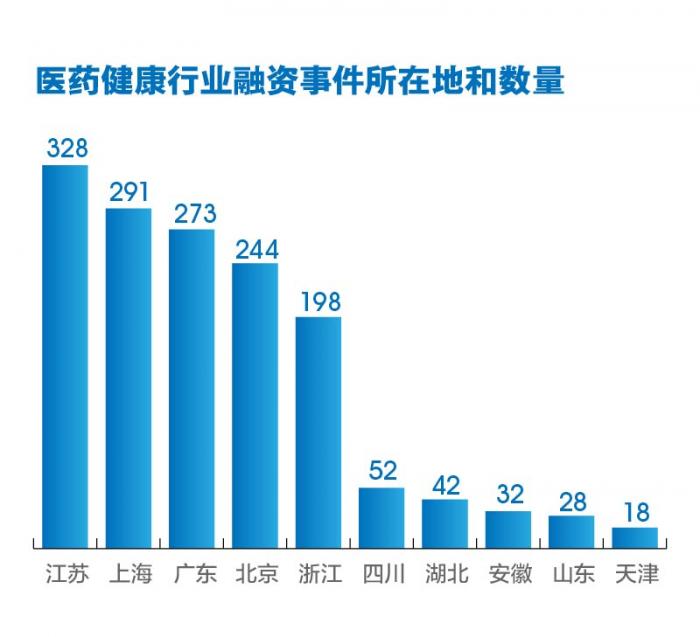 最后,从项目融资区域上看,统计期间内,超一线城市和东部沿海经济发达地区医药健康项目融资较多,其中江苏省融资事件最多,为328起,其实上海、广东省、北京和浙江省的融资事件也靠前,分别为291起、273起、244起和198起。医疗行业的发展与产业集中程度、人才供应、政策引导等都呈现出较高的相关性,例如江苏省苏州市人民政府印发的《苏州市生物医药产业创新集群建设实施方案》显示,到2025年,苏州力争产业规模突破4000亿元,产值突破3500亿元。