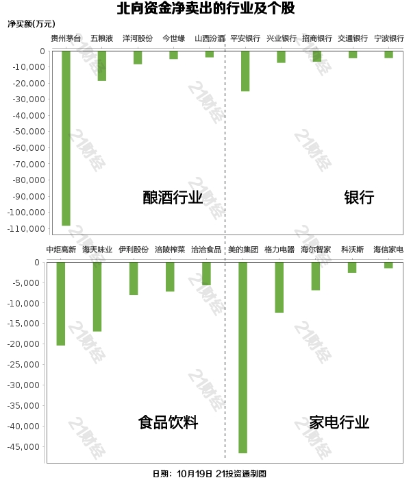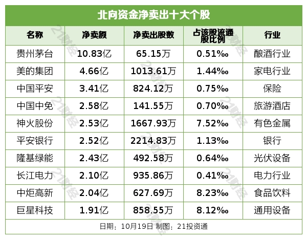 北向资金净卖出贵州茅台(600519.SH)、美的集团(000333.SZ)、中国平安(601318.SH)、中国中免(601888.SH)、神火股份(000933.SZ)居前,其中,贵州茅台被净卖出10.83亿元,美的集团被净卖出4.66亿元,中国平安被净卖出3.41亿元,中国中免被净卖出2.58亿元,神火股份被净卖出2.53亿元。
