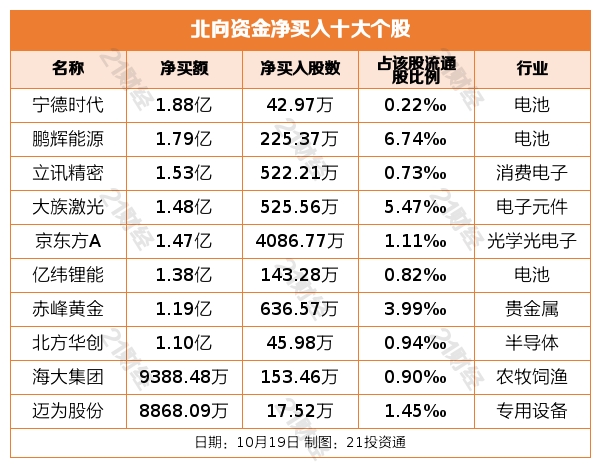 个股方面,北向资金净买入宁德时代(300750.SZ)、鹏辉能源(300438.SZ)、立讯精密(002475.SZ)、大族激光(002008.SZ)、京东方A(000725.SZ)居前,其中,宁德时代被净买入1.88亿元,鹏辉能源被净买入1.79亿元,立讯精密被净买入1.53亿元,大族激光被净买入1.48亿元,京东方A被净买入1.47亿元。