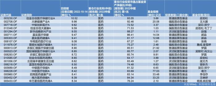 我们先来看10月14日单日。当天表现最好的是创金合信医疗保健行业A,回报达10.52%。