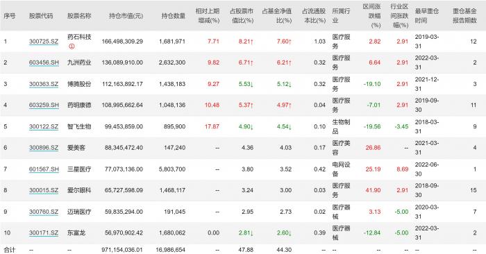 从基金二季报持仓来看,其十大重仓股的集中度较低,为44.3%,低于同类平均的48.19%,重仓了药石科技、九洲药业、博腾股份、药明康德等多只医疗服务个股。
