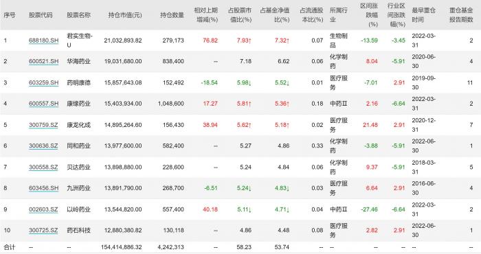 从基金二季报持仓来看,其前十大重仓股的集中度为53.74%,重点布局的化学制药板块的华海药业、同和药业、贝达药业等,以及医疗服务的药明康德、康龙化成、九洲药业、药石科技等。
