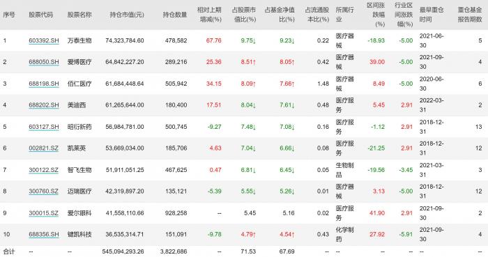 从基金二季报持仓来看,其十大重仓股集中度为67.69%,主要布局了万泰生物、爱博医疗、佰仁医疗等医疗器械个股,以及美迪西、昭衍新药、凯美英等医疗服务个股。
