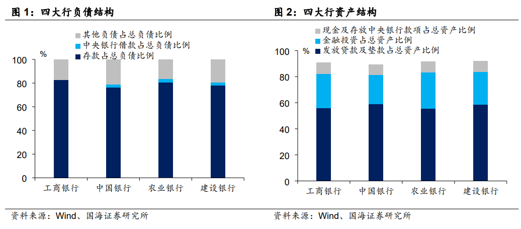以四大行为例,2022年中报显示,四大行存款占总负债比例平均为79.4%、中央银行借款占总负债比例2.1%、其他负债(拆入资金、同业存放、商业银行债等)占总负债比例18.5%。