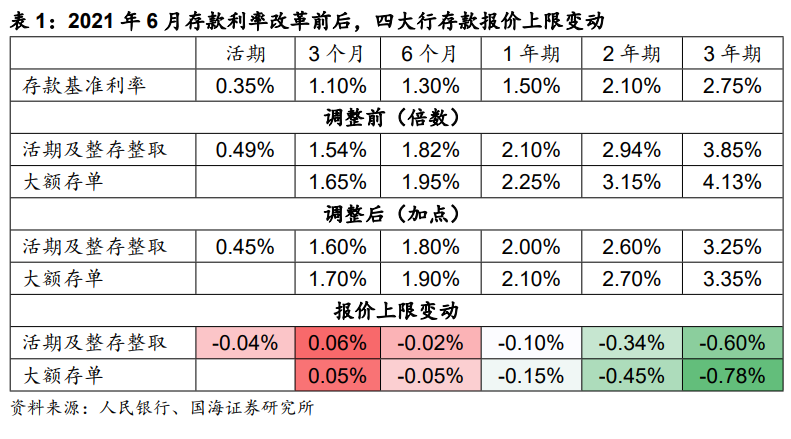 2021年6月,央行开始着手改革商业银行存款报价机制,由“基准利率*倍数”改为“基准利率+加点”,改革的同时,实现了1年期及以上存款报价的整体下行。