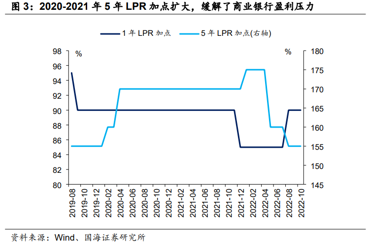 但是,国有商业银行净利润又需要上缴,关系着财政收入,不可能无止境让利。所以在实际操作中我们可以看到,2020至2021年,1年期LPR加点基本维持水平的同时,5年期LPR加点不断加大。除了基于地产调控因素,5年期LPR不适合下调之外,LPR加点的扩大,也可以缓解MLF与LPR同步下调过程中,商业银行净利润受到的侵蚀压力。
