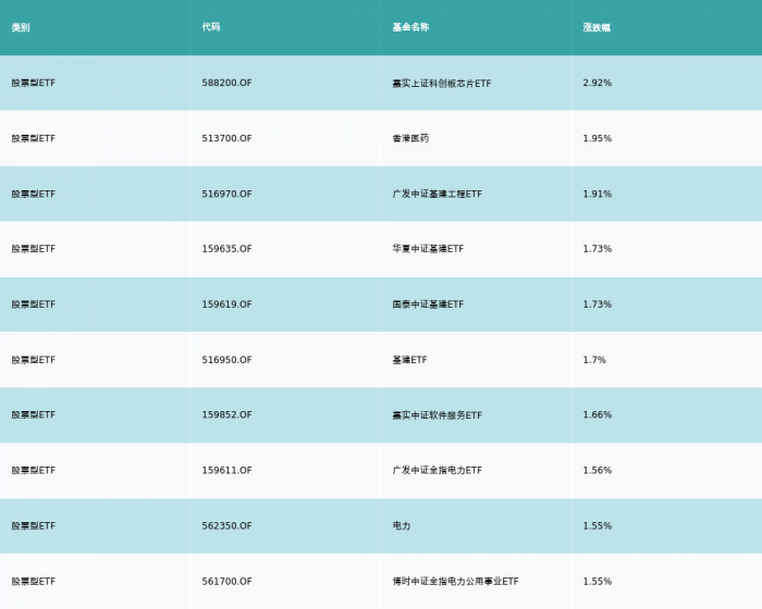 10月21日,股票型ETF涨幅最高的3支ETF及其收益率分别为:嘉实上证科创板芯片ETF(2.92%)、香港医药(1.95%)、广发中证基建工程ETF(1.91%)。涨幅前10详情见下表: