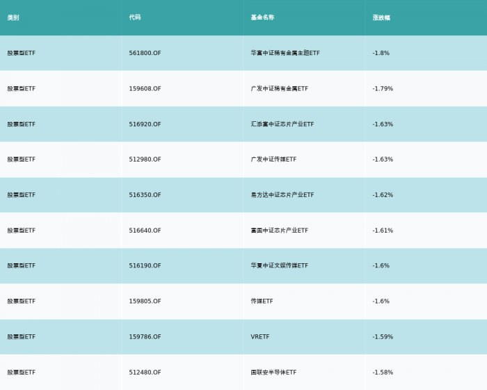 10月21日,股票型ETF跌幅最大的3支ETF及其收益率分别为:华富中证稀有金属主题ETF(-1.8%)、广发中证稀有金属ETF(-1.79%)、汇添富中证芯片产业ETF(-1.63%)。跌幅前10详情见下表: