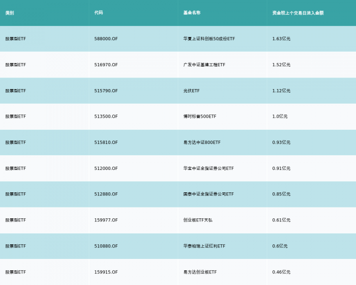 10月21日,股票型ETF资金流入最多的3支ETF及其流入金额分别为:华夏上证科创板50成份ETF(流入1.63亿元)、广发中证基建工程ETF(流入1.52亿元)、光伏ETF(流入1.12亿元)。资金流入前10详情见下表: