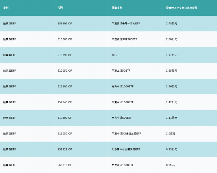 10月21日,股票型ETF资金流出最多的3支ETF及其流入金额分别为:华夏国证半导体芯片ETF(流出2.45亿元)、华泰柏瑞沪深300ETF(流出2.06亿元)、银行(流出1.71亿元)。资金流出前10详情见下表: