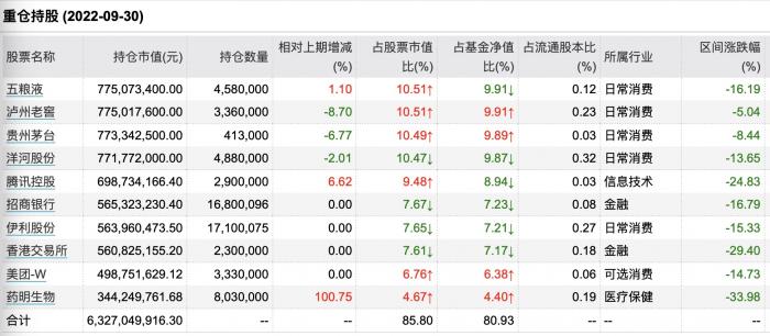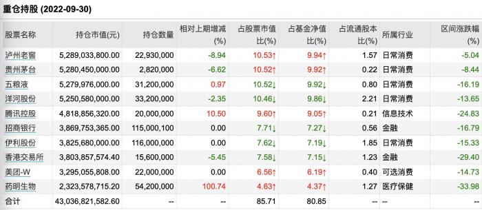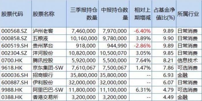 它三季度末前十大重仓股名单较二季度末也没有变化,同样在三季度减持泸州老窖、贵州茅台和洋河股份这3只白酒股,小幅加仓五粮液,此外,也同样增持腾讯控股、药明生物(大增100.75%)。