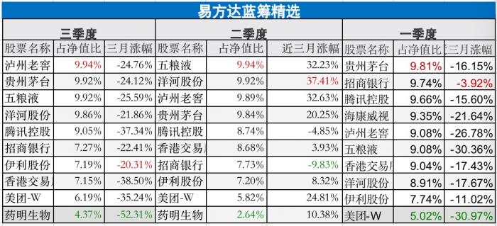 三季度末,易方达蓝筹精选的十大重仓股名单较二季度末没有发生变化,但是内部有加减仓。