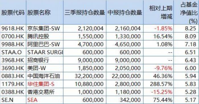 值得关注的是,三季度张坤增持了互联网科技股——腾讯控股,增幅为10.50%。