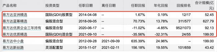 具体来看,易方达蓝筹精选-15.22%(同期业绩比较基准收益率为-13.08%)、易方达优质企业三年持有-15.15%(同期业绩比较基准收益率为-13.08%)、易方达优质精选-14.39%(同期业绩比较基准收益率为-13.05%)、易方达亚洲精选-14.99%(同期业绩比较基准收益率为-9.26%)。