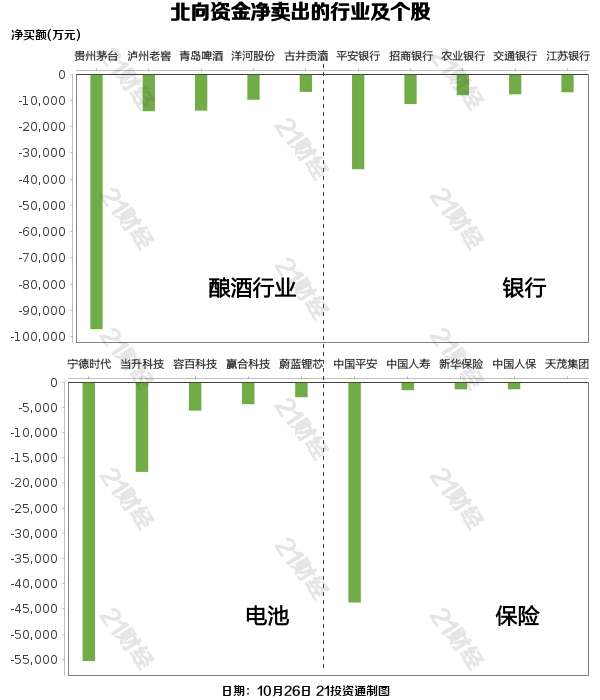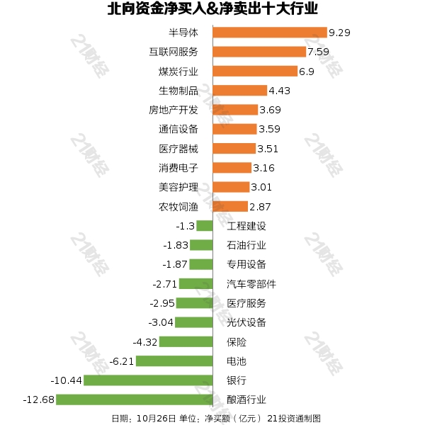 北向资金减持了27个行业,其中酿酒行业最多,净卖出金额达12.68亿元,其次是银行行业,净卖出10.44亿元。