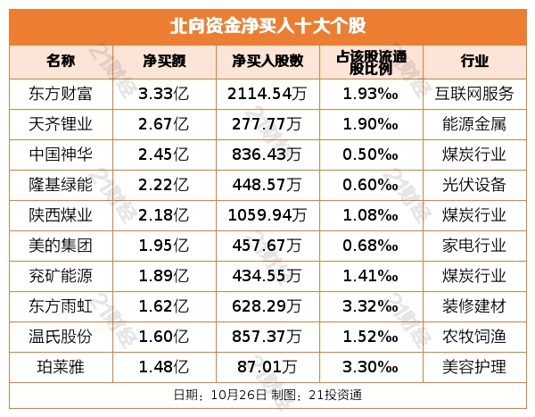 个股方面,北向资金净买入东方财富(300059.SZ)、天齐锂业(002466.SZ)、中国神华(601088.SH)、隆基绿能(601012.SH)、陕西煤业(601225.SH)居前,其中,东方财富被净买入3.33亿元,天齐锂业被净买入2.67亿元,中国神华被净买入2.45亿元,隆基绿能被净买入2.22亿元,陕西煤业被净买入2.18亿元。