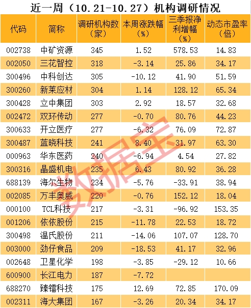 中矿资源成为近一周调研机构数量最多的上市公司,合计有345家机构调研了该公司。