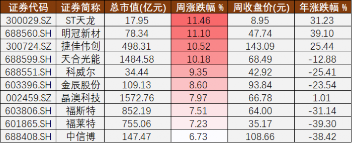 根据Wind数据,本周有23只光伏概念股涨幅为正。周涨幅超过10%的个股有4只。ST天龙(300029.SZ)、明冠新材(688560.SH)、捷佳伟创(300724.SZ)在板块内领涨,周涨幅分别为11.46%、11.10%、10.52%。