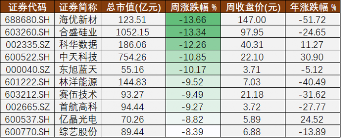 海优新材(688680.SH)、合盛硅业(603260.SH)、科华数据(002335.SZ)在板块内领跌,周跌幅分别为13.66%、13.34%、12.26%。