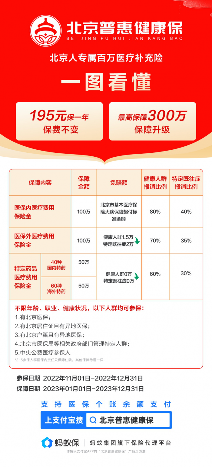 11月1日,由北京市医保局、北京市金融监管局共同指导,北京银保监局监督的2023年“北京普惠健康保”正式开售。在保费不变的基础上,支持医保个人账户余额缴费,还伴有多项升级:一是扩大参保人群,北京新市民今年也能参保;二是下降多个责任免赔额,特效药责任免赔额更是从2万直降为0元;三是优化特效药结构,由于部分旧的自费特效药被纳入医保,2023年“北京普惠健康保”替换了新的自费特药进入理赔范围。