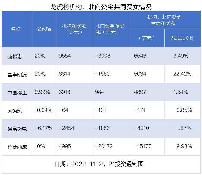 值得注意的是,机构和北向资金共同净买入了中国稀土;共同净卖出了风语筑、通富微电等2股;在晶丰明源,康希诺,德赛西威上出现分歧,机构净买入晶丰明源6614.11万元,北向资金净卖出1580.48万元;机构净买入康希诺9554.34万元,北向资金净卖出3008.39万元;机构净买入德赛西威4995.46万元,北向资金净卖出2.02亿元。