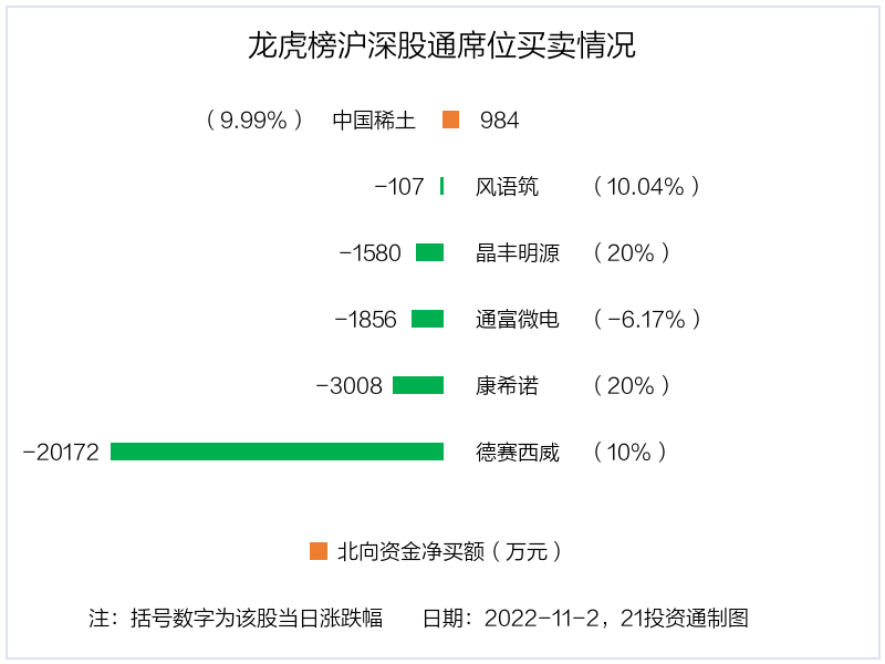 北向资金净买入中国稀土(000831.SZ)983.79万元,占总成交金额的0.31%。净卖出金额最多的是德赛西威(002920.SZ),为2.02亿元,占总成交金额的13.2%。