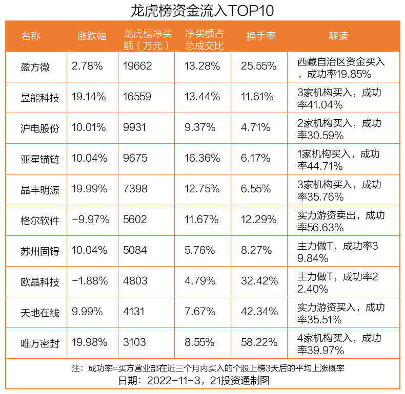 11月3日,上证指数下跌0.19%,深证成指下跌0.34%,创业板指上涨0.01%。盘后龙虎榜数据显示,共有41只个股因当日异动登上龙虎榜,资金净流入最多的是盈方微(000670.SZ),达1.97亿元。