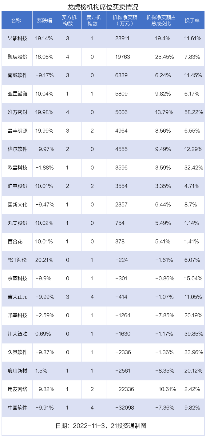 11月3日,21只个股龙虎榜出现了机构的身影,机构合计净买入1.78亿元。具体来看,机构净买入12股,净卖出9股。