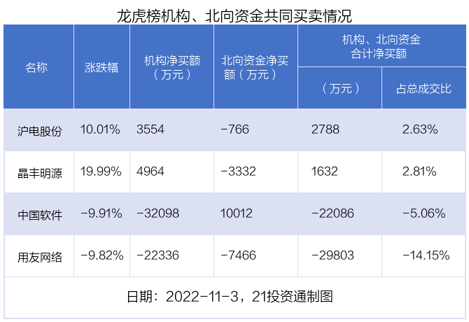 值得注意的是,机构和北向资金共同净卖出了用友网络;在中国软件、沪电股份、晶丰明源上出现分歧,机构净卖出中国软件3.21亿元,北向资金净买入1亿元;机构净买入沪电股份3554.01万元,北向资金净卖出766.35万元;机构净买入晶丰明源4964.04万元,北向资金净卖出3332.03万元。