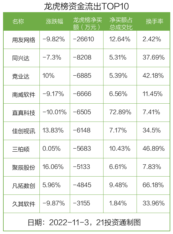 而龙虎榜中资金净流出最多的是用友网络(600588.SH),被净卖出为2.66亿元,占总成交金额的12.64%。用友网络收盘下跌9.82%,换手率为2.42%。