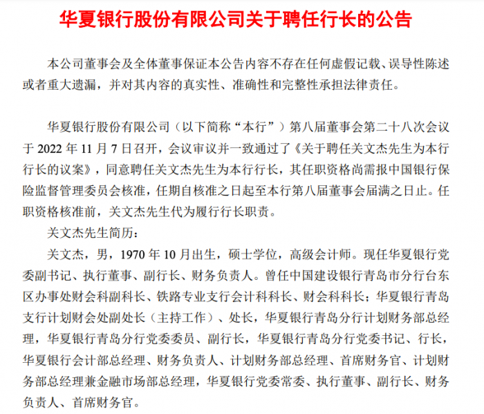 21世纪经济报道记者 边万莉 北京报道 华夏银行行长人选终于有所眉目。 11月7日晚,华夏银行发布公告表示,同意聘任关文杰先生为该行行长,其任职资格尚需报中国银行保险监督管理委员会核准。任职资格核准前,关文杰代为履行行长职责。